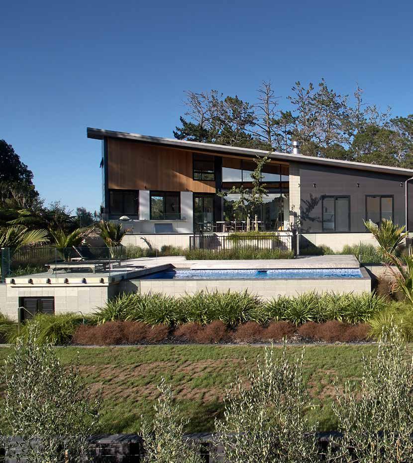 A modern angular skillion roof, bold gable or flat roof style adds clean modernist lines to the façade and immediately evoke a contemporary Kiwi and coastal architectural style.