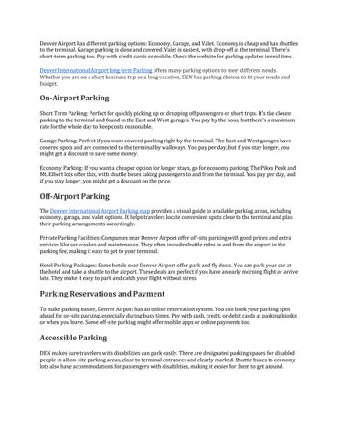 DenverAirporthasdifferentparkingoptions:Economy,Garage,andValet.Economyischeapandhasshuttles totheterminal.Garageparkingiscloseandcovered.Valetiseasiest,withdrop-offattheterminal.There's short-termparkingtoo.Paywithcreditcardsormobile.Checkthewebsiteforparkingupdatesinrealtime.