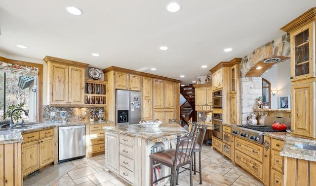 This residence features marble flooring throughout and a variety of elegant interior details, including a first-floor entry, built-in bar, custom cabinetry, a spacious cooking island with pantry, walk-in closets, and thoughtfully designed closet systems.