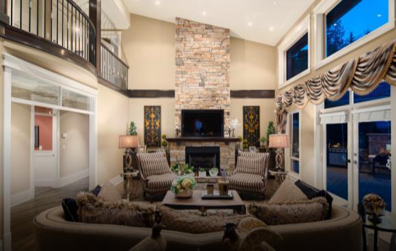 Lake Home at the finest Hill Country living in this stunning Mediterranean-inspired estate, nestled in the highly sought-after Hollows community on the North Shore of Lake Travis. Perfectly positioned to capture sweeping lake views, this home blends timeless design with resort-style amenities. Living area with Accent stone wall and fireplace.