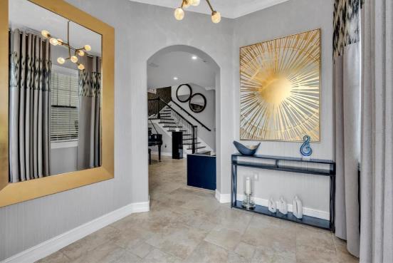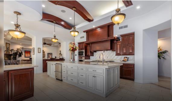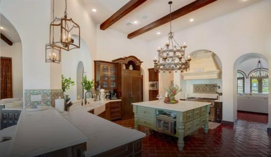 有名なインテリアデザイナー「住居デザイン」によるこ の見事なモダンな地中海の家は、片側にプライマリ スイートとオフィス、もう片側にセカンダリベッドルー ムと寛大なゲームルームを備えた分割フロアプラン を提供しています。むき出しの木の梁のある美しい アーチ型の天井は、玄関からフォーマルなリビング ルーム、ダイニングエリアとキッチンエリアを横切って 大きなファミリールームに広がっています。