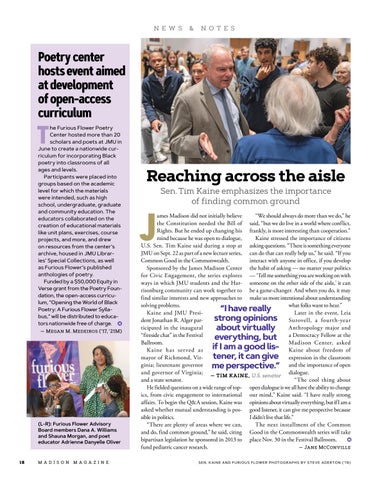 ames Madison did not initially believe “We should always do more than we do,” he the Constitution needed the Bill of said, “but we do live in a world where conflict, Rights. But he ended up changing his frankly, is more interesting than cooperation.” mind because he was open to dialogue, Kaine stressed the importance of citizens U.S. Sen. Tim Kaine said during a stop at asking questions. “There is something everyone JMU on Sept. 22 as part of a new lecture series, can do that can really help us,” he said. “If you Common Good in the Commonwealth. interact with anyone in office, if you develop Sponsored by the James Madison Center the habit of asking — no matter your politics for Civic Engagement, the series explores — ‘Tell me something you are working on with ways in which JMU students and the Har- someone on the other side of the aisle,’ it can risonburg community can work together to be a game-changer. And when you do, it may find similar interests and new approaches to make us more intentional about understanding solving problems. what folks want to hear.” “I have really Kaine and JMU PresiLater in the event, Leia strong opinions Surovell, a fourth-year dent Jonathan R. Alger participated in the inaugural Anthropology major and about virtually “fireside chat” in the Festival everything, but a Democracy Fellow at the Ballroom. Madison Center, asked if I am a good lis- Kaine about freedom of K a ine ha s ser ved a s tener, it can give expression in the classroom mayor of Richmond, Virginia; lieutenant governor me perspective.” and the importance of open and governor of Virginia; dialogue. — TIM KAINE, U.S. senator and a state senator. “The cool thing about He fielded questions on a wide range of top- open dialogue is we all have the ability to change ics, from civic engagement to international our mind,” Kaine said. “I have really strong affairs. To begin the Q&A session, Kaine was opinions about virtually everything, but if I am a asked whether mutual understanding is pos- good listener, it can give me perspective because sible in politics. I didn’t live that life.” “There are plenty of areas where we can, The next installment of the Common and do, find common ground,” he said, citing Good in the Commonwealth series will take bipartisan legislation he sponsored in 2013 to place Nov. 30 in the Festival Ballroom. fund pediatric cancer research. — Jane McConville S E N . K A I N E A N D FU R I O U S FLOW E R PH OTO G R A PH S BY ST E V E A D E RTO N ( ’ 1 9)