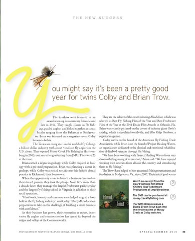 They are the subject of the award-winning Blood Knot, which was selected as Best Fly Fishing Film of the Year and Best Freshwater Film of the Year at the 2014 Drake Film Awards in Orlando, Fla. Brian was recently pictured on the covers of industry giant Orvis’s catalog, which is circulated worldwide, and Blue Ridge Outdoors, a regional magazine. Colby serves on the board of the American Fly Fishing Trade Association, while Brian is on the board of Project Healing Waters, an organization dedicated to the physical and emotional rehabilitation of disabled veterans through fly fishing. “We have been working with Project Healing Waters from very close to the beginning of its creation,” Brian said. “We have enjoyed working with veterans from all over the country and introducing them to fly fishing.” The Trows have helped to host an annual fishing tournament and fundraiser in Bridgewater, Va., since 2007. Their initial goal was to Watch an excerpt from the award-winning film Blood Knot by TwoFisted Heart Productions at j.mp/bloodknot The DVD can be purchased at mossycreekflyfishing.com (Far left): Brian releases a plump Brown Trout back into the fertile waters of Mossy Creek as Colby watches.