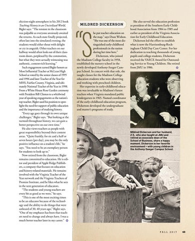 he put teacher education on the map,” says Dean Wishon. “She was one of the most distinguished early-childhood professionals in the nation during her time here.” Dickerson, who joined the Madison College faculty in 1958, established the nursery school in the newly developed Anthony-Seeger Campus School. In concert with that role, she taught classes for the Madison College education students who were observing and working with preschool children. Her expertise in early-childhood education was invaluable to Madison’s future teachers when Virginia mandated public kindergarten in 1965. Named coordinator of the early-childhood education program, Dickerson developed the undergraduate and master’s programs of study.