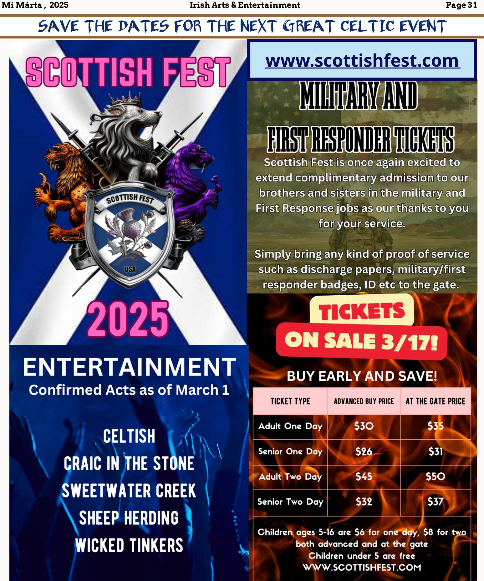 Once again, the Irish Arts& Entertainment will be part of the Irish Contingent. Asalways, the organizersremind us that one of the very best elementsof Scottish Fest: "Thereisnoneedtobe Scottishtojointheexcitement! ScottishFest is theperfect way tocelebrate, explore, andmake lastingmemories!"