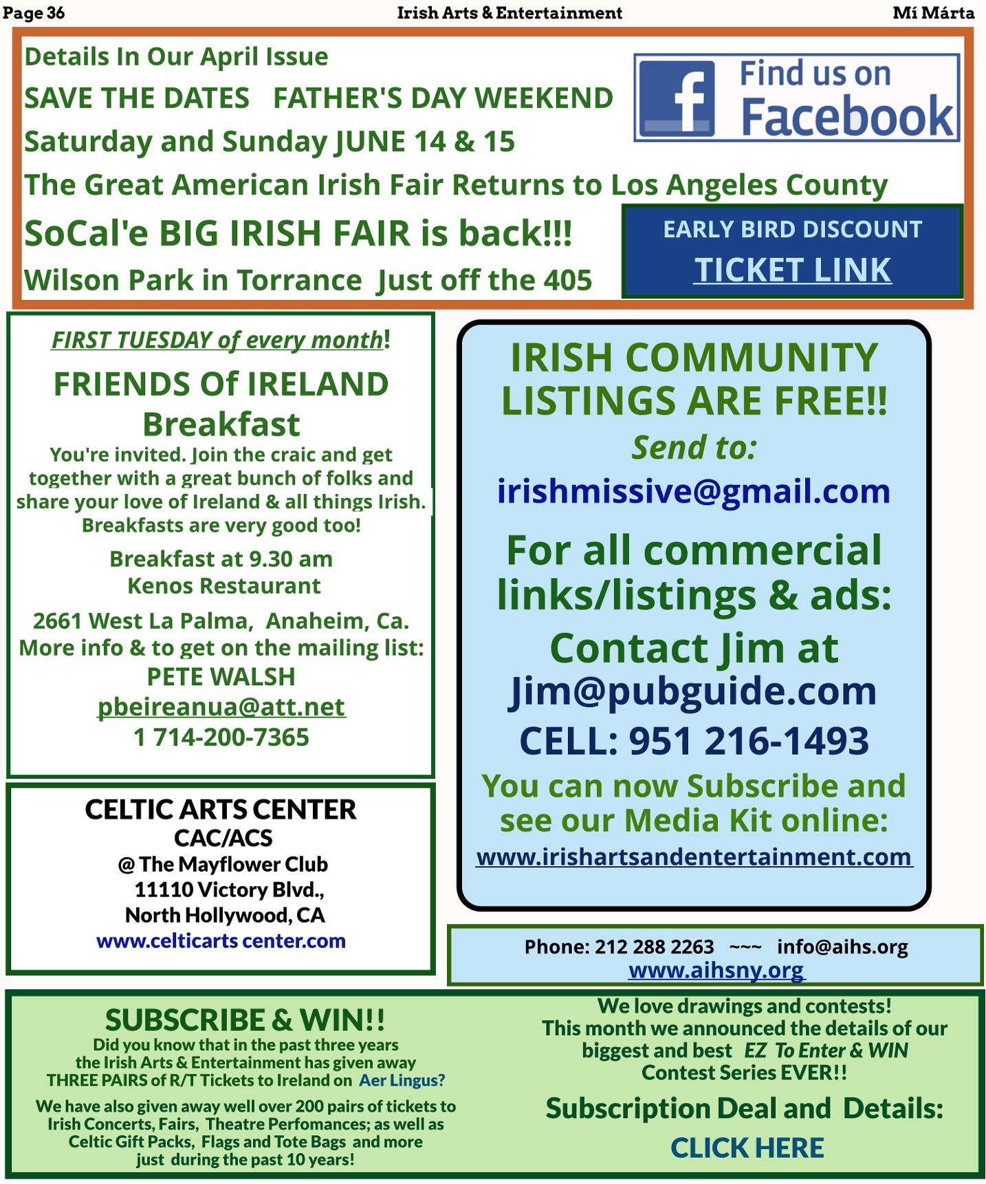 IRISH ARTS & ENTERTAINM ENT CALENDAR