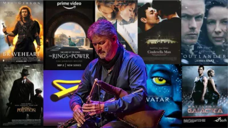 band playing an array of traditional Celtic instruments, including bodhrán, tin whistle, bouzouki and Uilleann pipes