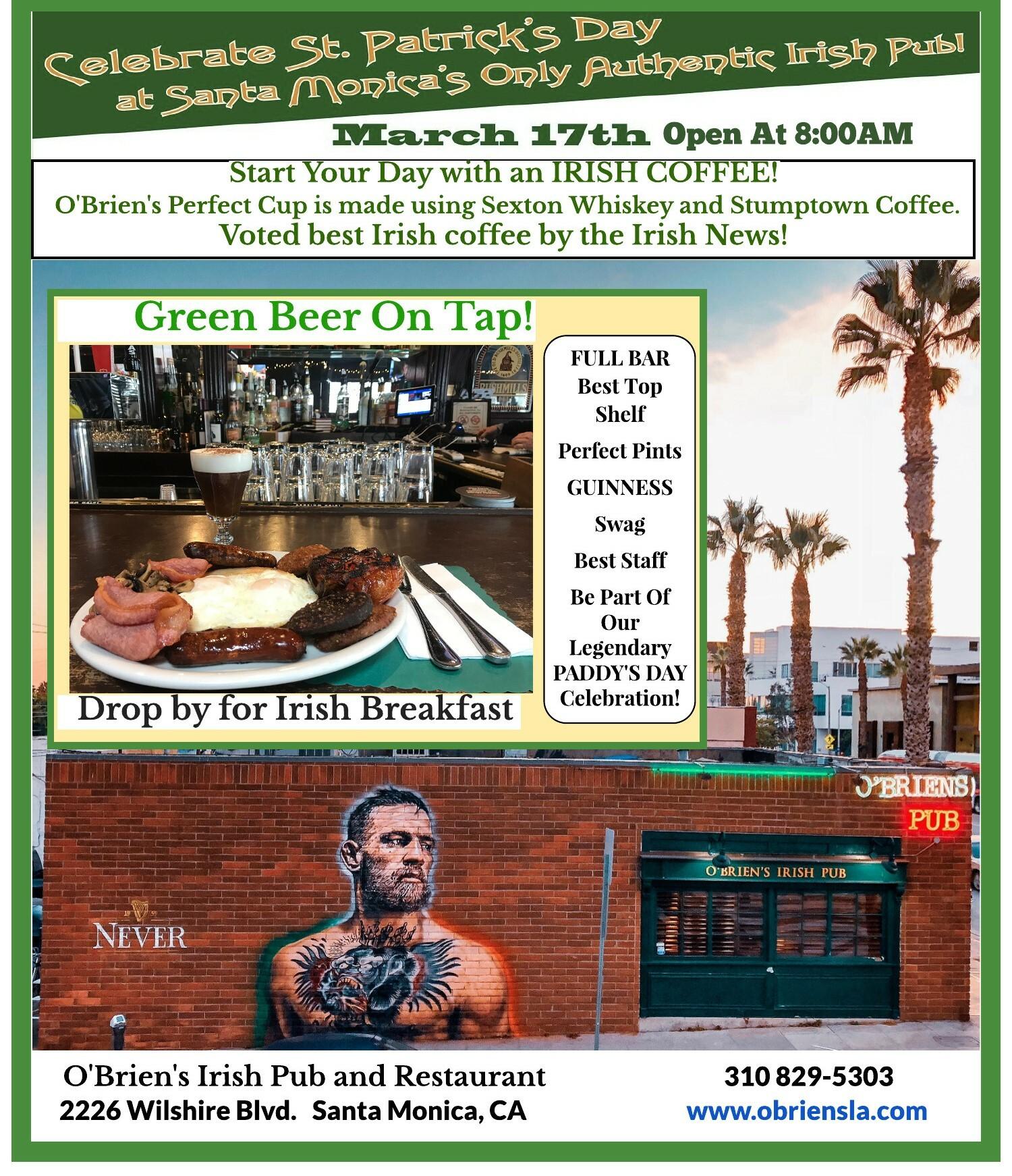 O'Brien's On Wilshire in Sant a Monica w ill give our subscribers a Free Appet izer w it h purchase w w w.obriensla.com