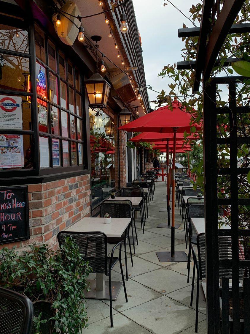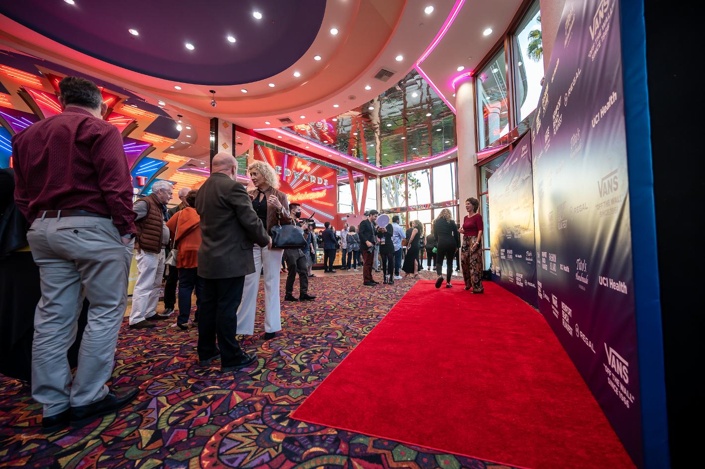 BELOW on the left: Red Carpet & Packed lobby at t he Big New port Cinem a w hich is next t o Muldoon's Pub Court yard of Muldoons
