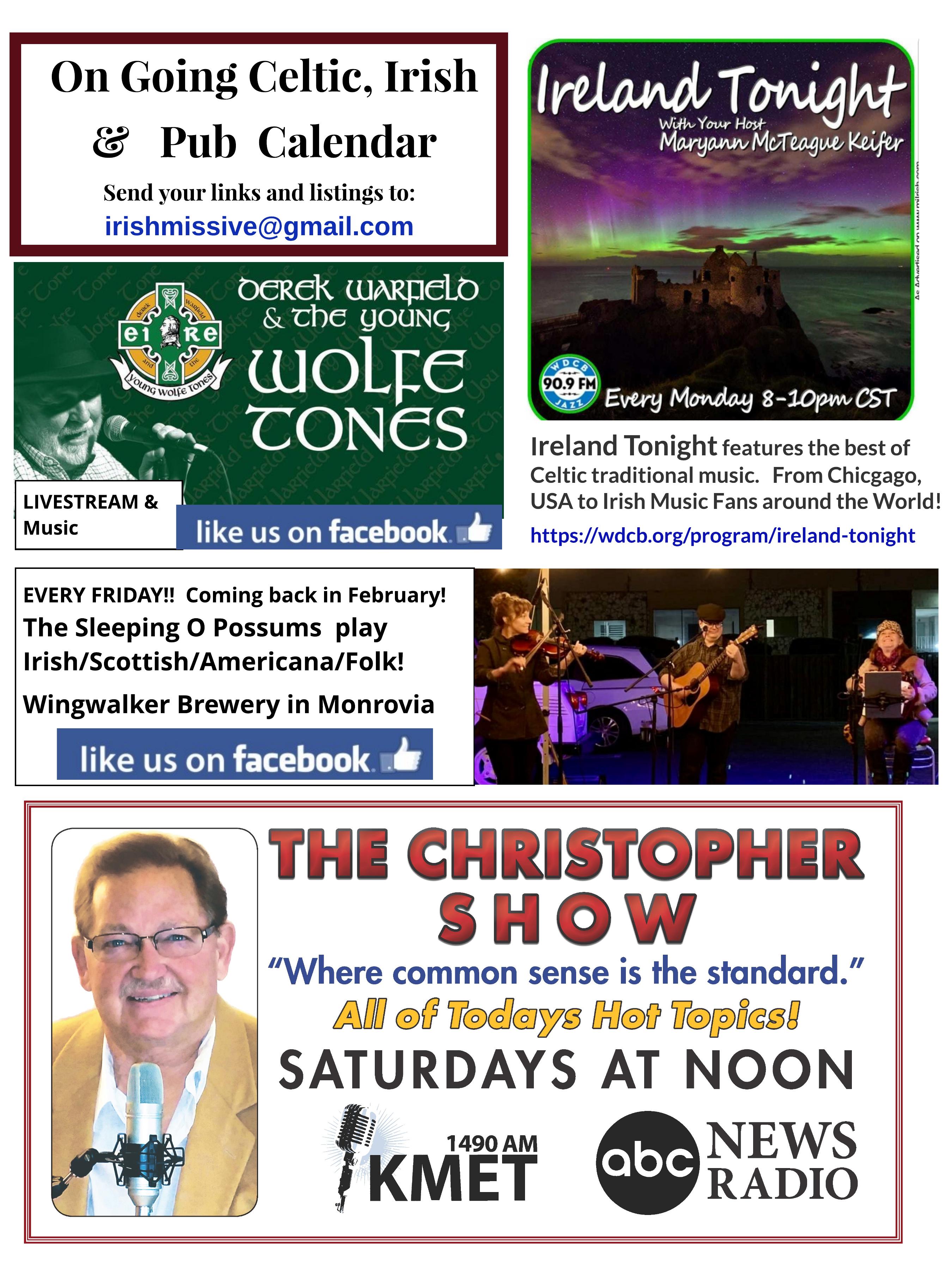 Peace Lut heran Church Irish Sessions w w w facebook com / groups/ OCCelt icJam / We cont inue t o host Zoom sessions every Monday evening. CELTIC ARTS CENTER CAC/ACS meets at The Mayflower Club 11110 Victor y Blvd., Nor th Hollywood, CA w w w .cel ti car ts cen ter .com October, 2022 Irish Arts & Entertainment Page 37 w w w.harpinn.com Check t he w ebsit e for all of t he ent ert ainm ent and sport s 7 Days a Week