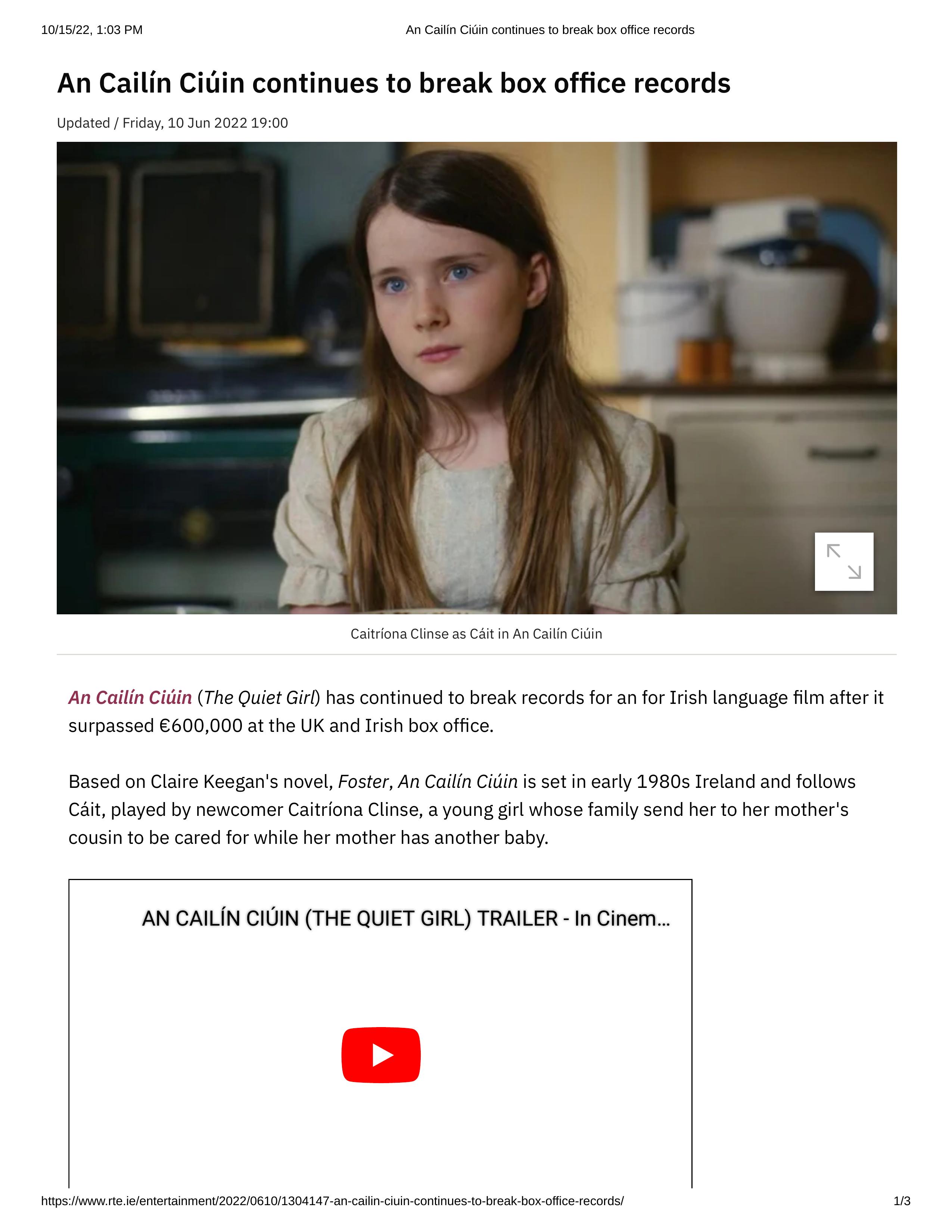 past sum m er, The Quiet Girl broke records as t he highest grossing Irish language film in Ireland and in t he nort h of Ireland (UK) . The film also w on aw ards and great audience review s at 2022''s European Film Fest ivals including Berlin and Venice. According t o t he Hollyw ood Report er, The Quiet Girl has signed w it h Super Film s for US dist ribut ion but no dat e for st ream ing services or t heat er screenings has been set