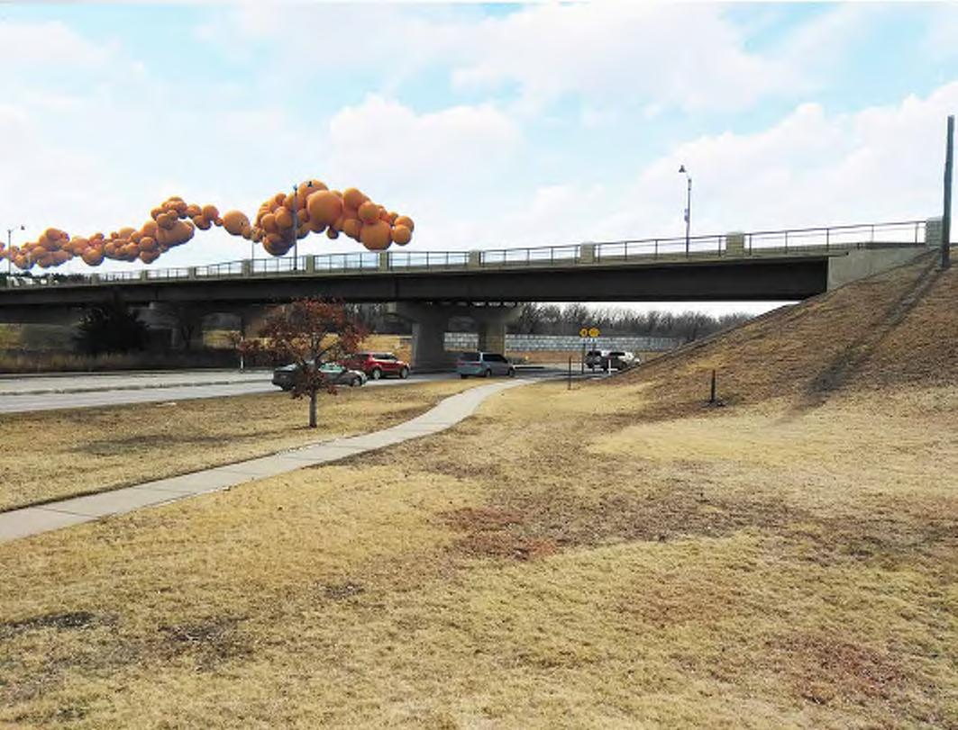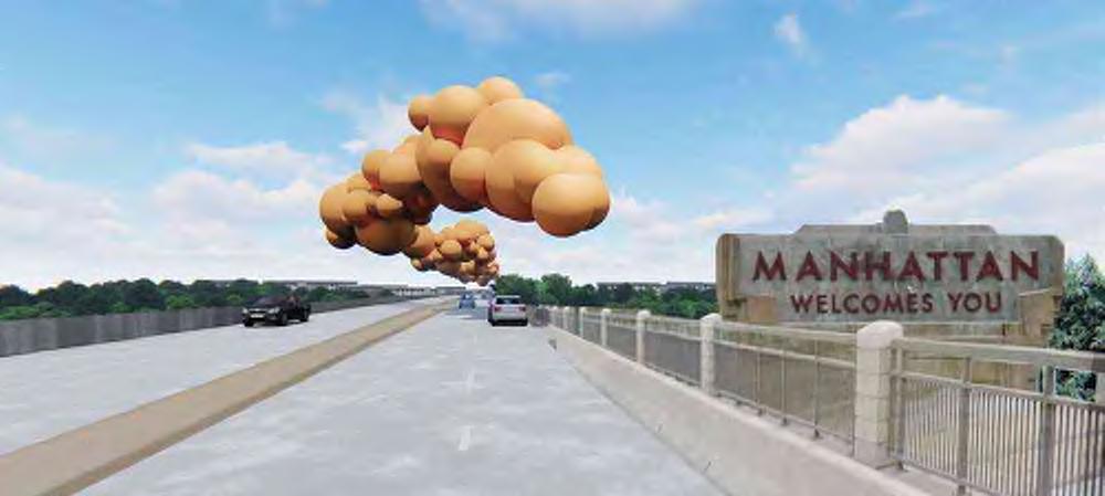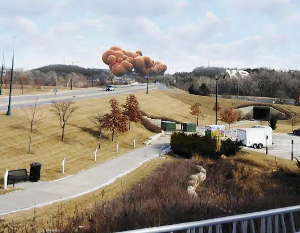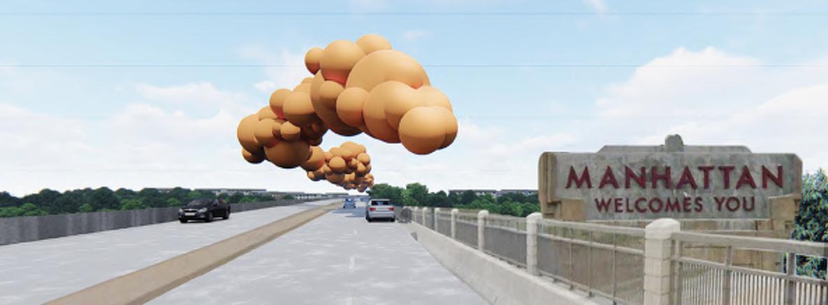 Booming Bridge is an homage to the ecological significance of the Flint Hills and the Lesser Prairie Chicken. The design is comprised of 120 connected balloon structures that inflate from the significant wind pressure over the Kansas River. These balloons emulate the Unique “Booming” mating ritual of the Prairie Chicken. The collected form of this instillation came from the rolling topography of the region.