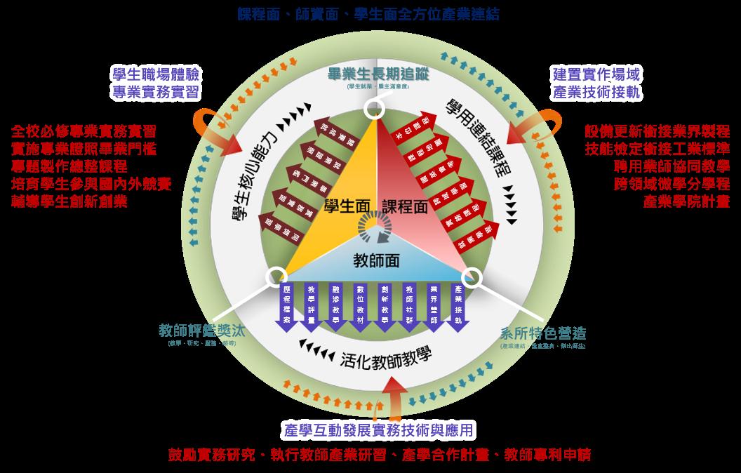 「學中做」 及「務實致用」,作為技職教育之定位,且以「實務教學」 及「實作、 創新與終身學習之能力培養」,作為核心價值,俾以經由 技職教育培養 實務及創新能力俱佳之優質專業技術人才,成為帶動產 業發展、提升產 業研發、創新與永續發展,及促進社會融合之重要碁 柱。