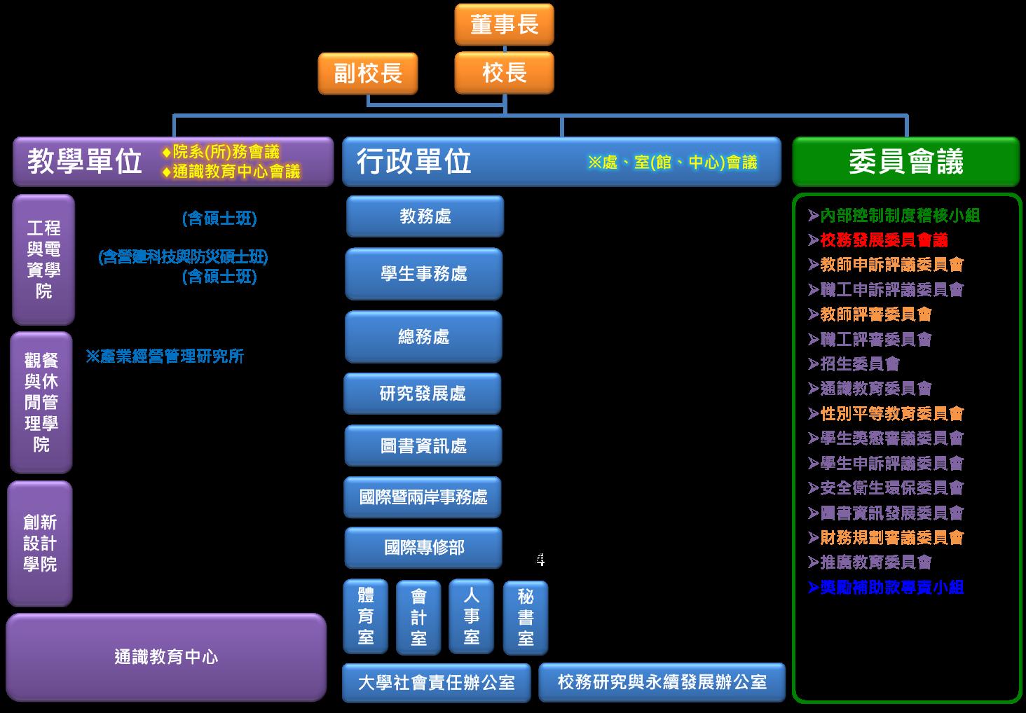 本校置校長一人,綜理校務,負校務發展之責,對外代 表本校,其資格依相關法律之規定,其任期三年。校長 得置副校長一人至二人,由校長遴聘教授或職級相當之 研究人員、專業技術人員兼任之,襄助校長處理校務。 行政單位之整體組織架構依111年08月11日教育部臺教 技(二)字第 1110074402 號准予核定通過之「組織規程」 進行運作,共設立13個一級行政單位、23個下轄單位。