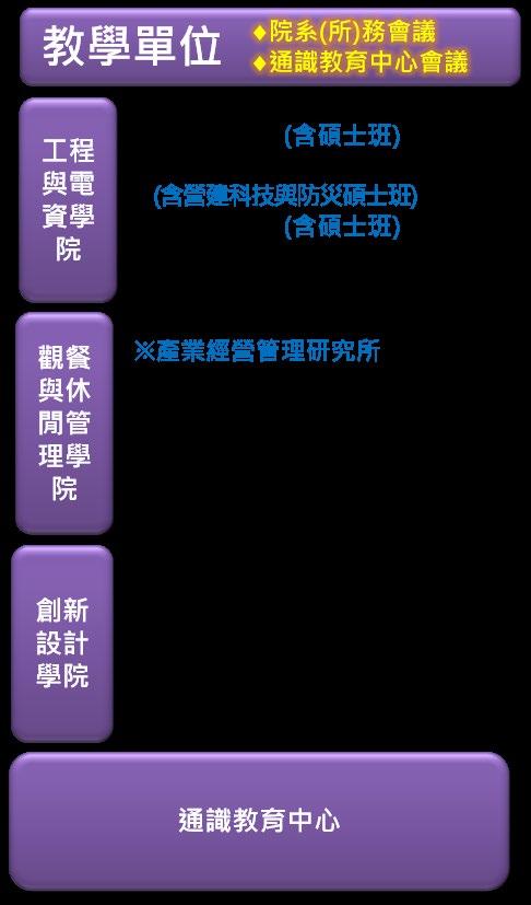 學術單位組織架構 本校以研究學術,教授應用科技,培育高級實用專業 人才,提升文化,服務社會,促進國家產業發展為宗 旨,學術單位分設學院、創新創業教育中心(院級), 院級學術單位分設系、研究所,各學院、 系、研究所 之設立、變更或停辦,經校務會議通過,報請教育部 核定後實施 各學院各置院長一人,由具教授資格者兼任,綜理院 務 各系各置系主任一人,各獨立研究所各置所長一人, 由具副教授以上資格者兼任,綜理系、所業務。各系 主任