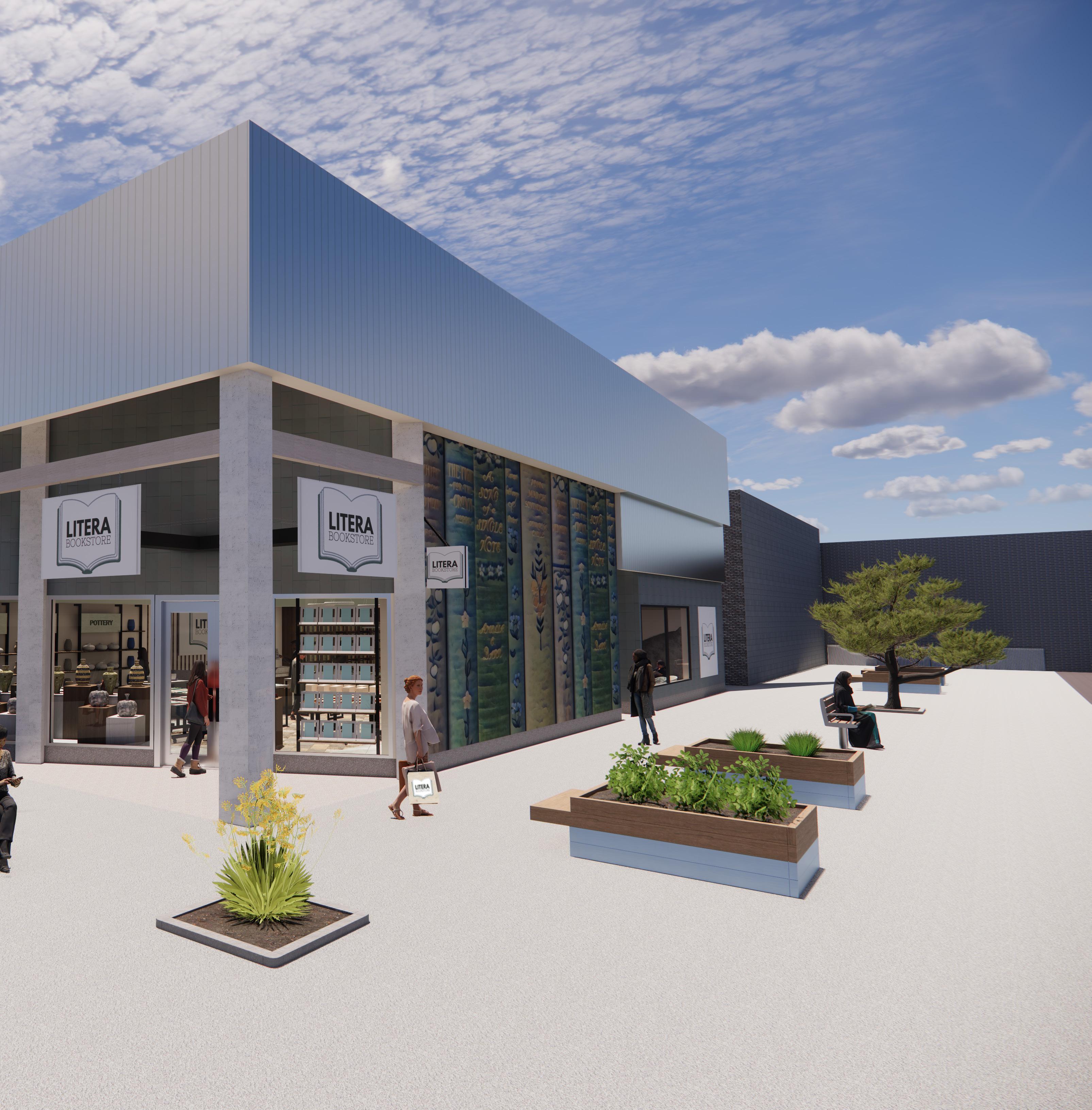 On the exterior, the goal was to attract our target market, which was readers and artists. The final product was a creative mural of a set of books. The branding colors were also used on the exterior to begin the Litera experience before even entering the bookstore.
