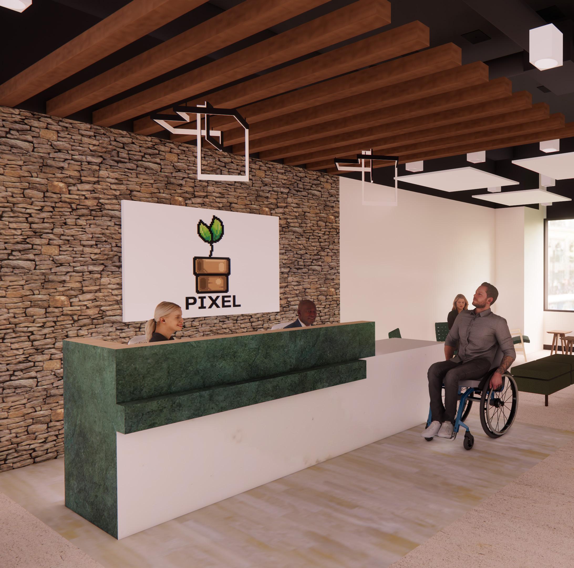 Pixel is a coworking office space that inspires creativity in graphic designers through the combination of natural and textural elements with sleek and square elements. This concept is motivated by the hardware and software components of a computer.