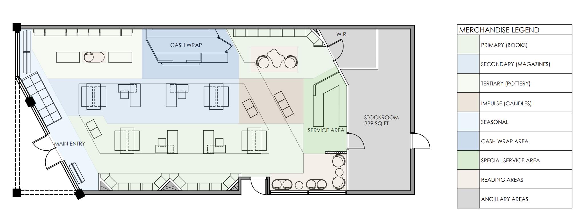 The merchandise planning for Litera was strategic to not only bring in customers but keep them intrigued and eager to follow to flow of the store. The main entry and windowline was surrounded by seasonal merchandise to attract consumers while to the right of the entrance, the primary merchandise is found to keep the customers engaged. The plan followed the principle of flow in a retail environment: from the right making a circle around to the left. It was an efficient use of space and allowed for clear designation for the cash wrap and service area.