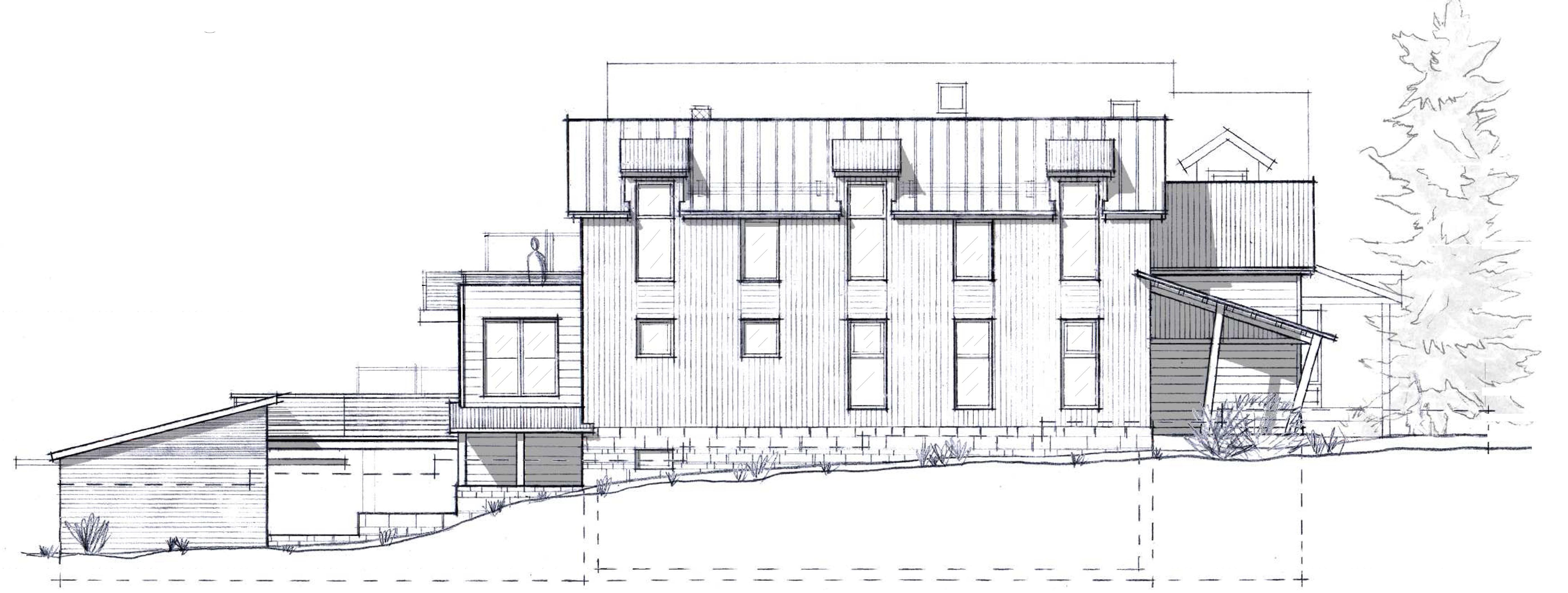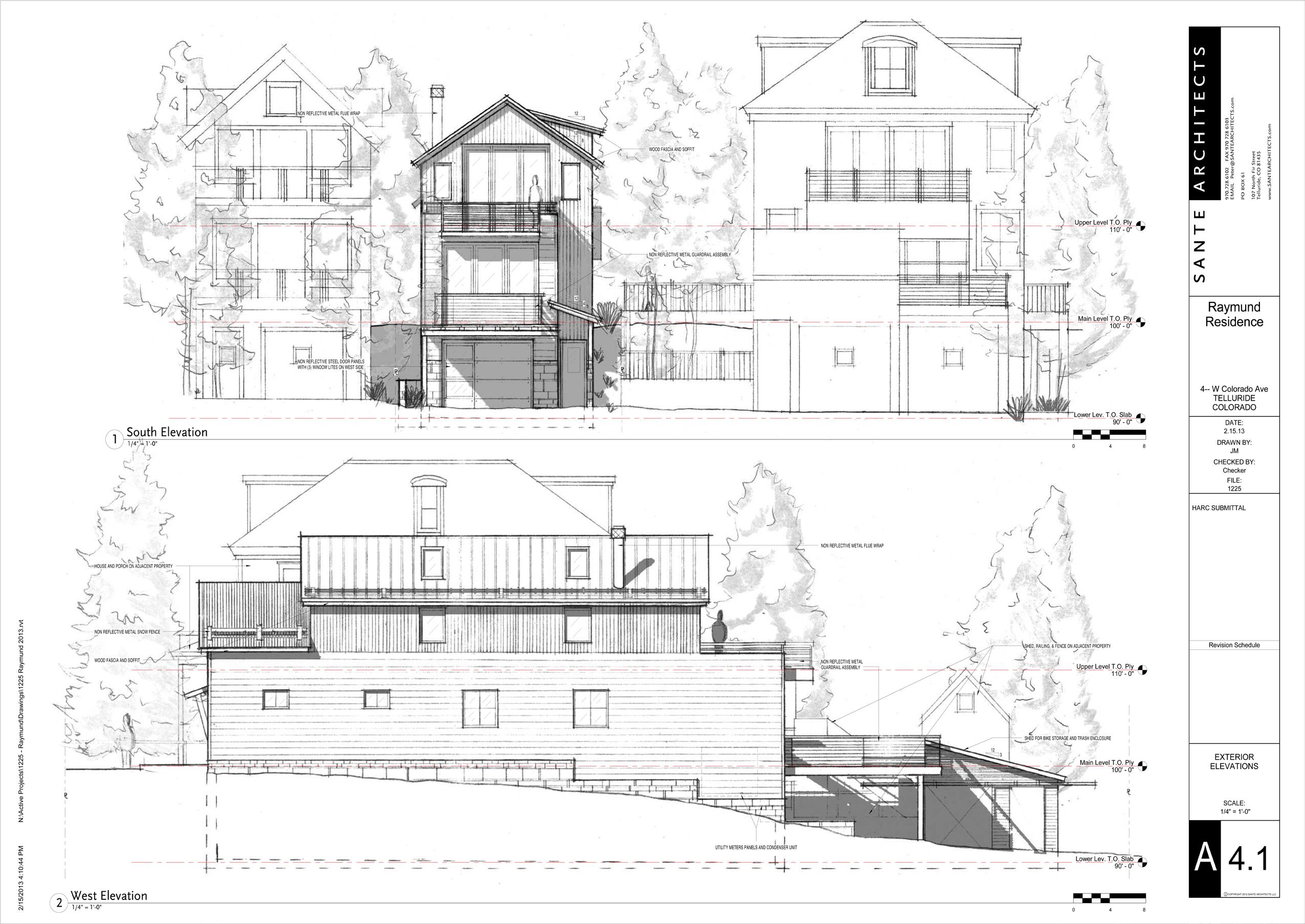 right: hand drawn south and west building elevations