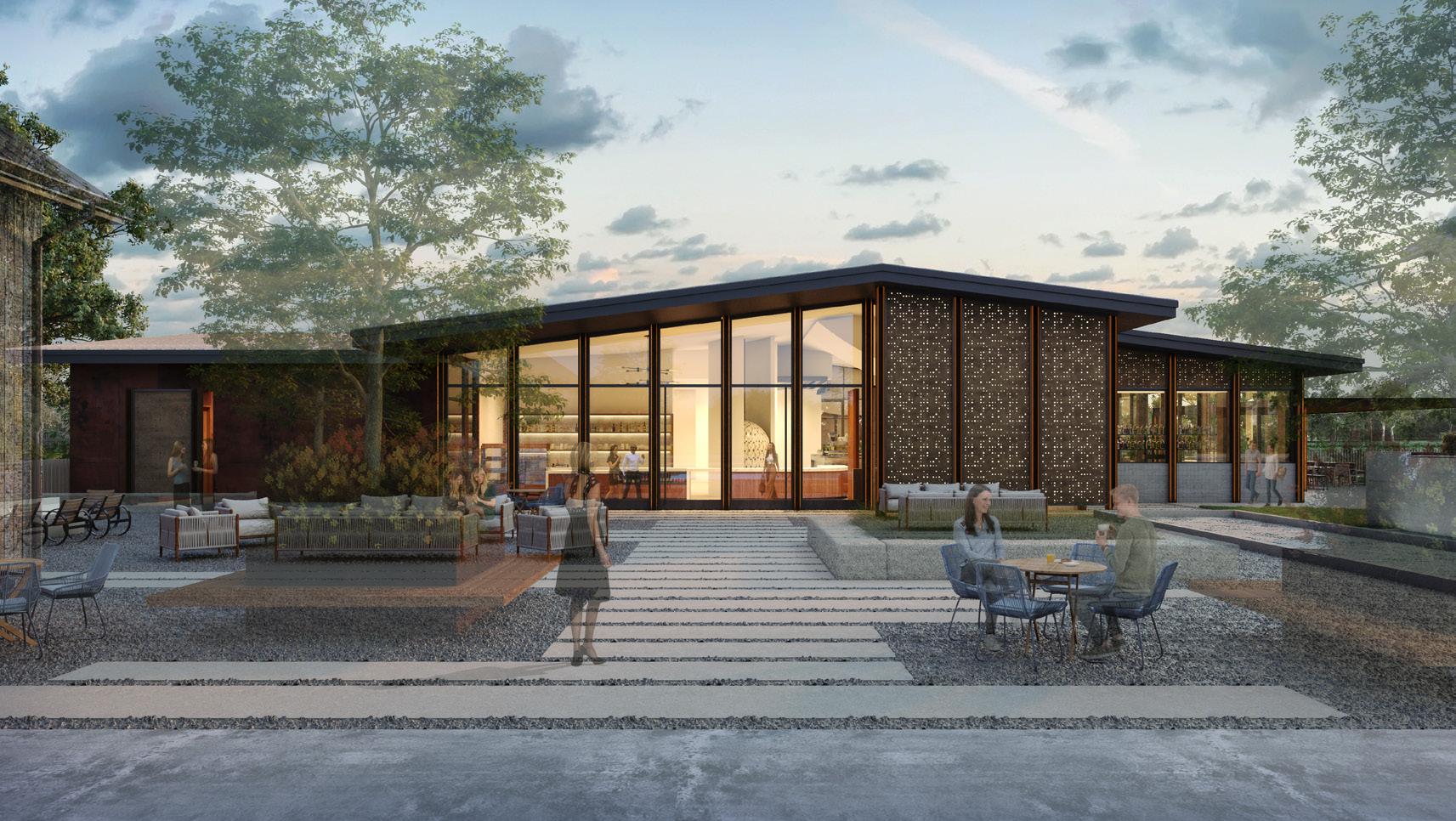 • Multiple outdoor spaces including courtyard, outdoor living room, and event lawn