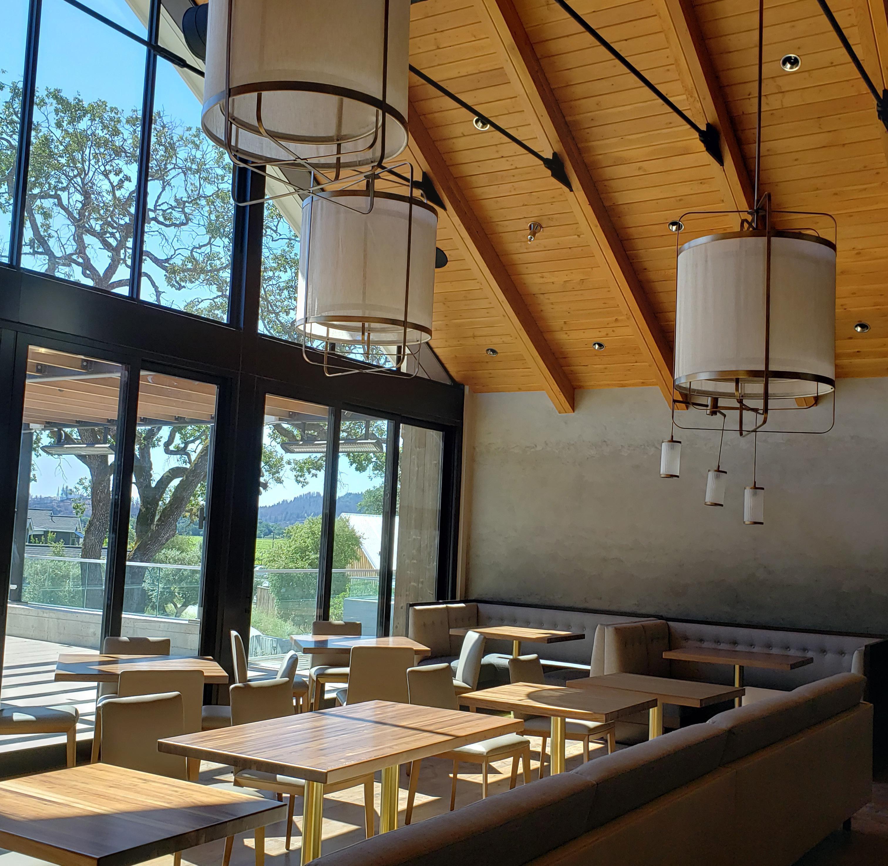 right: interior dining room adjacent to exterior dining patio pictured on left at Truss restaurant