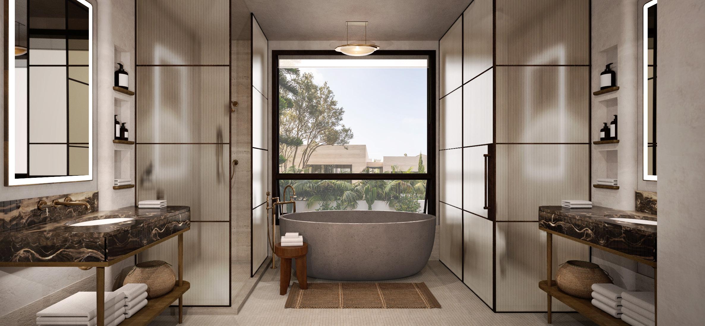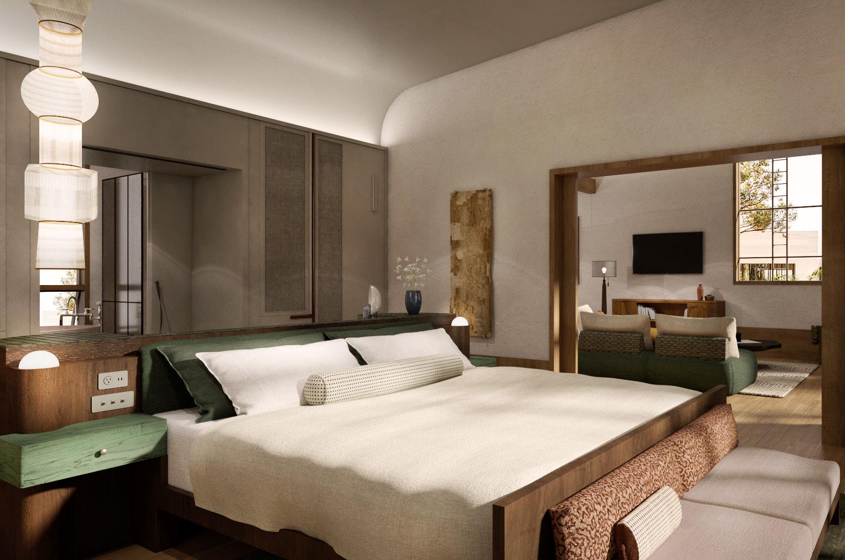 splash page: rendering view of the site from the northeast left: Suite bedroom, rendering by interior design group PLD NYC above right: typical guestroom bathroom, rendering by PLD NYC right: restaurant north