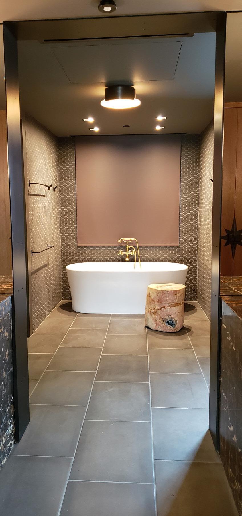 middle: tub, shower, & WC area in 1-bedroom guestroom