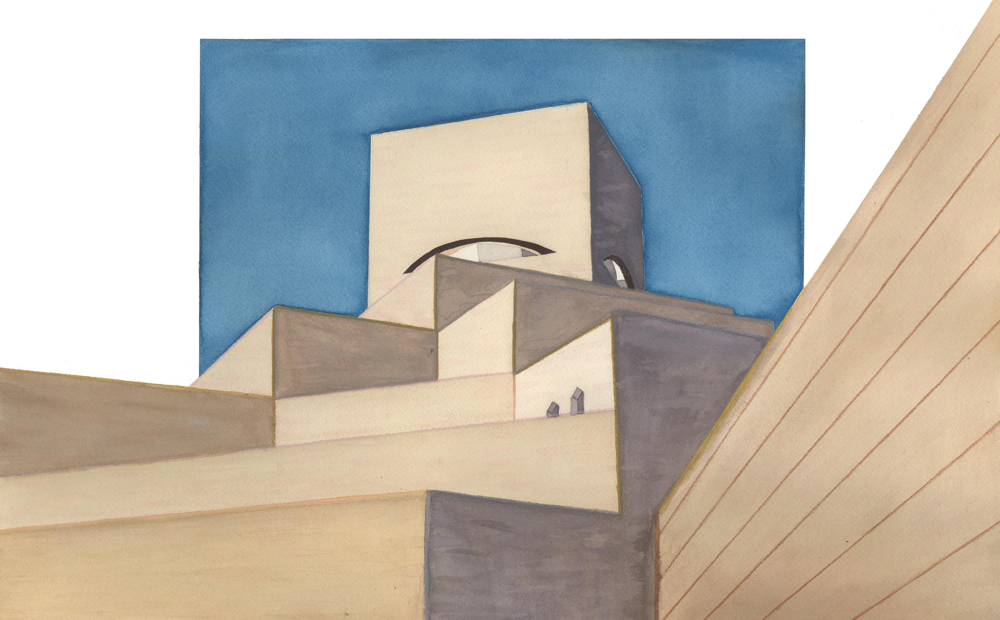 right: watercolor painting of the Museum of Islamic Art in Qatar designed by I. M. Pei. This was one of the final assignments for Watercolor for Architects.