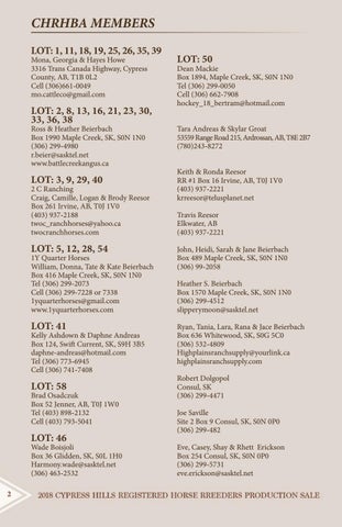 Dean Mackie Box 1894, Maple Creek, SK, S0N 1N0 Tel (306) 299-0050 Cell (306) 662-7908 hockey_18_bertram@hotmail.com Tara Andreas & Skylar Groat 53559 Range Road 215, Ardrossan, AB, T8E 2B7 (780)243-8272 Keith & Ronda Reesor RR #1 Box 16 Irvine, AB, T0J 1V0 (403) 937-2221 krreesor@telusplanet.net Travis Reesor Elkwater, AB (403) 937-2221 John, Heidi, Sarah & Jane Beierbach Box 489 Maple Creek, SK, S0N 1N0 (306) 99-2058 Heather S. Beierbach Box 1570 Maple Creek, SK, S0N 1N0 (306) 299-4512 slipperymoon@sasktel.net Ryan, Tania, Lara, Rana & Jace Beierbach Box 636 Whitewood, SK, S0G 5C0 (306) 532-4809 Highplainsranchsupply@yourlink.ca highplainsranchsupply.com Robert Dolgopol Consul, SK (306) 299-4471 Joe Saville Site 2 Box 9 Consul, SK, S0N 0P0 (306) 299-482 Eve, Casey, Shay & Rhett Erickson Box 254 Consul, SK, S0N 0P0 (306) 299-5731 eve.erickson@sasktel.net