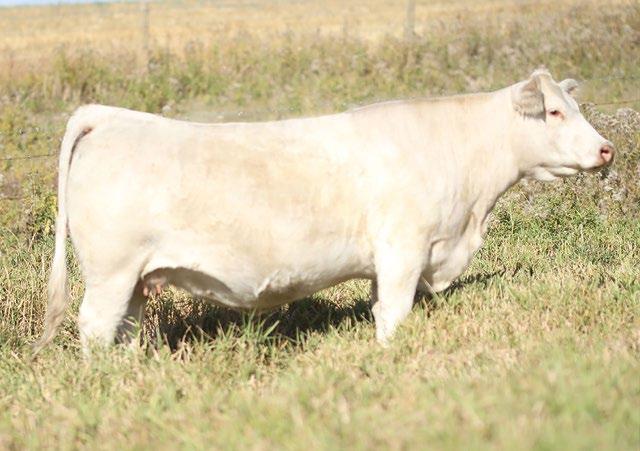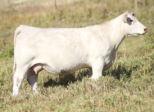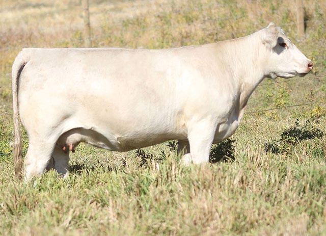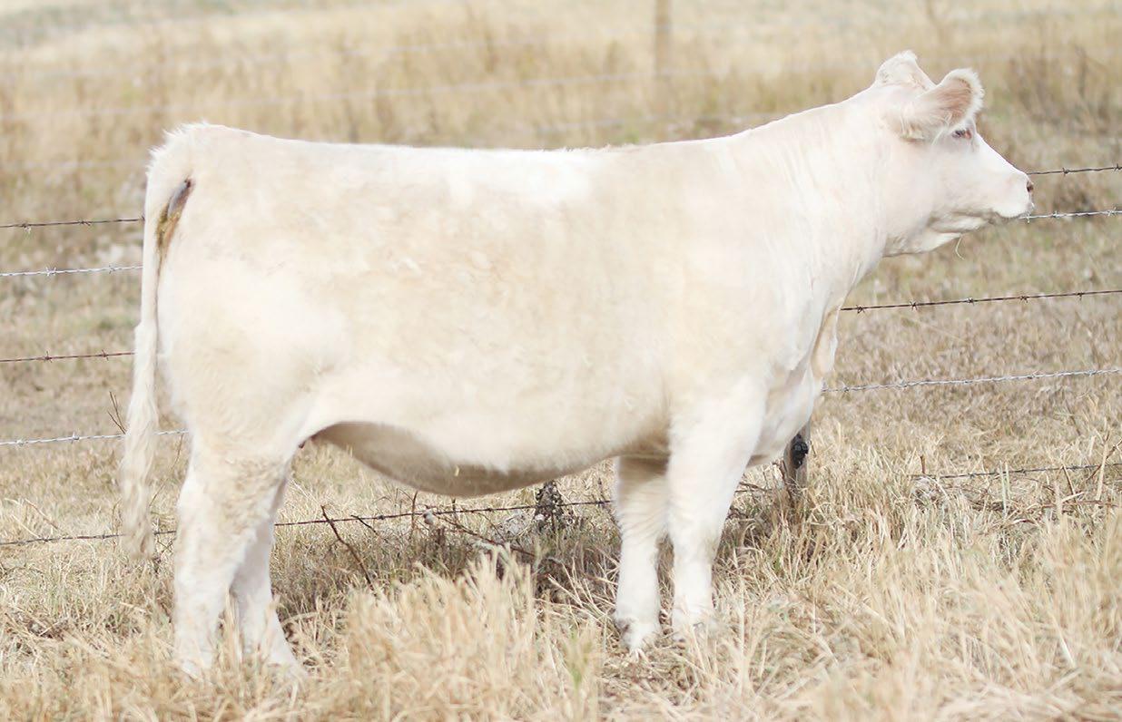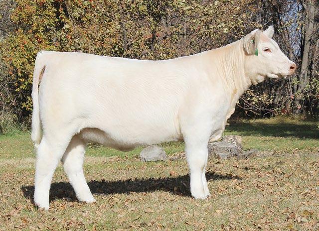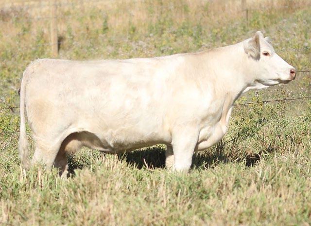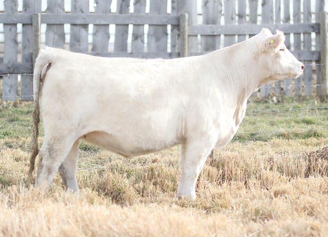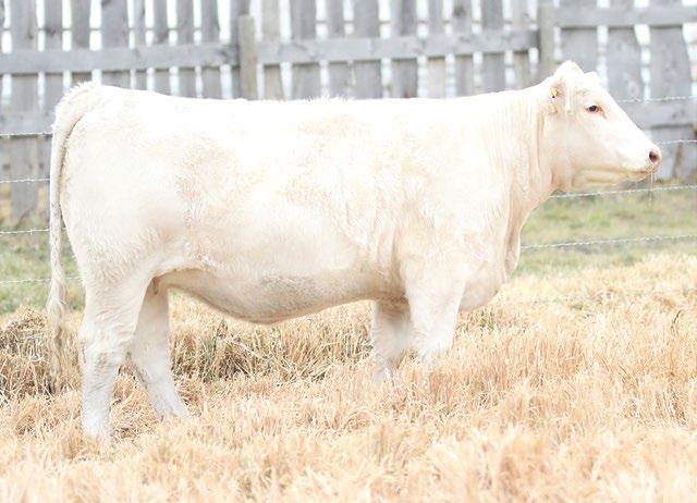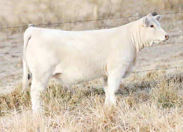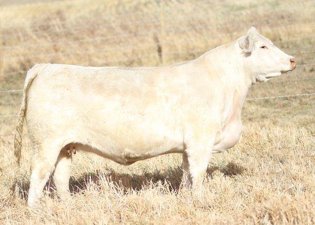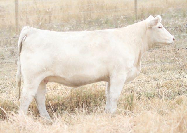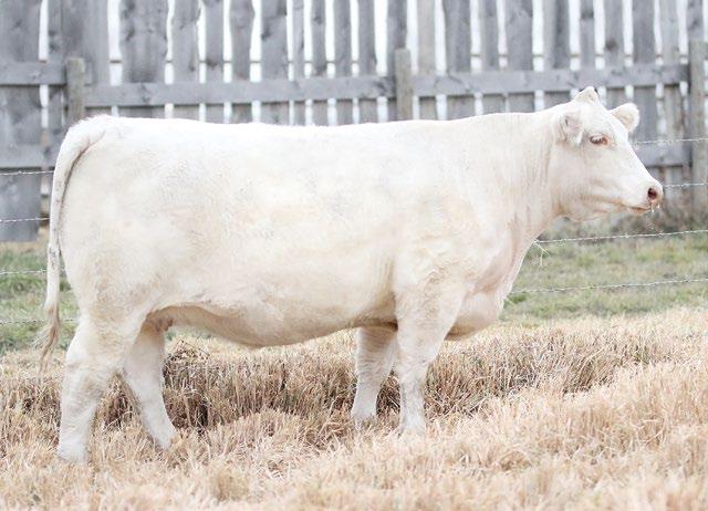 I write these footnotes and try to be different and not always repeat myself. So I am going to share a story with you. I followed the Charolais Queen, Thomas MS Impressive 0641 for years, as she made herself famous being the mother of so many great white animals, Turton, Ivory Angel, Rapid Fire, Kimmy Cakes, Bottoms Up, and many, many more. Justine and I went to Jr nationals in Min nesota the summer of 2015, it was a great time and met some incredible peo ple, and seen some very special cattle. We had the opportunity to tour Polzin Cattle and we laid our eyes on our wonderful PZC Lily 5013 ET, and later that fall purchased her and needless to say that worked out extremely well. But we also had the opportunity to see Thomas MS Impressive 0641 that day as well. A very Impressive beast! (pardon the pun). Since that day we have tried adding as much blood from 0641 as possible, here is your chance! Bred April 14 to WC Benelli 2134 P ET. Due January 24 2023