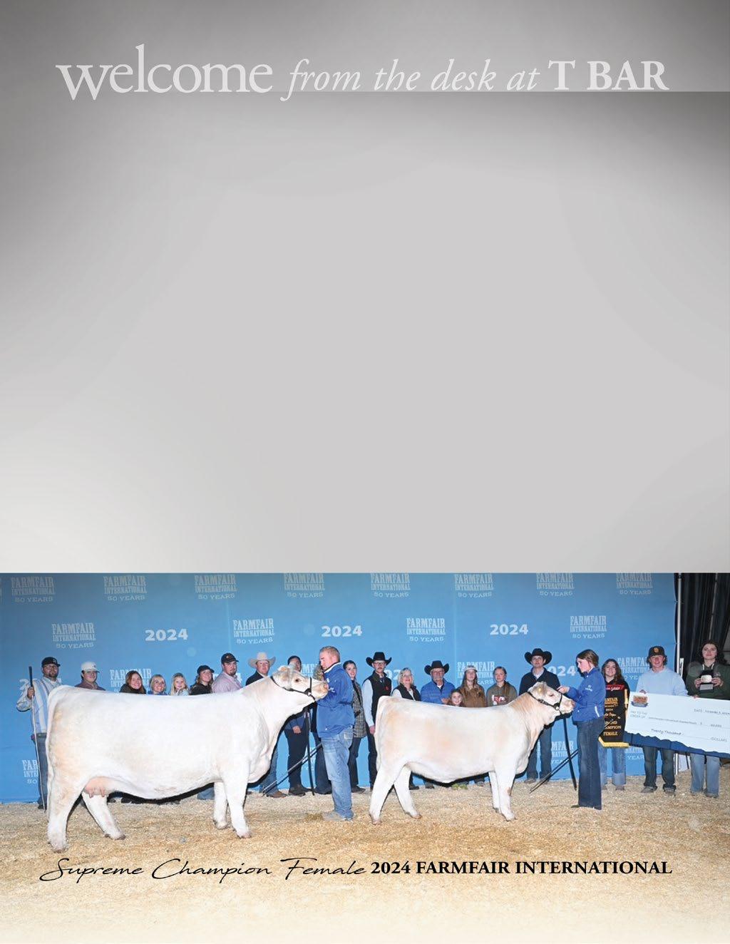 Terms: The terms of the sale are cash or cheque, payable at par at the sale location. The right of property shall not pass until after settlement has been made; no invoicing on buyers in attendance, unless previous arrangements have been made. Every animal sells to the highest bidder and in cases of disputes, the auctioneer’s decision will be final. Current exchange rates will be announced sale day. All monies are in Canadian funds. Bidding: Each animal will sell to the highest bidder... no by-bidding will be permitted. Disputes - Bidding will be reopened between the parties involved in dispute. If no further bidding is made, the buyer will be the person from whom the auctioneer accepted the last bid. The auctioneer’s decision on all disputes will be final. Announcements: All announcements made from the auction block will take precedence over the printed matter in the catalogue. Buyers are therefore cautioned to pay close attention to such disclosures. Breeder’s Guarantee: Should any bull fourteen (14) months of age or over fail to prove a breeder after being used on females known to be breeders, the matter shall be reported in writing to the seller within six (6) months following the date of purchase or six (6) months after the bull has reached fourteen (14) months of age. The seller will have the right and privilege of six (6) months to prove the bull a breeder. No guarantee is given that semen collected from the bull will freeze. Exception Guarantee: In cases where the animal is subjected to any hormonal or surgical reproduction techniques after the sale, this guarantee shall be null and void. Certificate of Registration: Each animal will carry papers issued by the Canadian Charolais Association. A certificate of registry duly transferred will be furnished to the buyer for each animal after payment has been made. Liabilities: All persons attend the sale at their own risk. The seller, facility owner and sale manager assume no liability, legal or otherwise, for any accidents that occur. It is understood that T Bar C Cattle Co. Ltd. is acting only as a medium between buyer and seller and is not responsible for any failure on the part of either party to live up to his obligations. Neither does T Bar C Cattle Co. Ltd. assume any financial obligations to collect or enforce collection of any monies between parties and any legal action that may in exceptional cases be taken must be between the buyer and the seller. T Bar C Cattle Co. Ltd. assumes no responsibility for any credit extended by the seller to the buyer. The buyer must look to the seller for fulfillment of all guarantees and representations made hereunder. Rights and Obligations: The above terms and conditions of the sale shall constitute a contract between the buyer and seller and be equally binding to both. Resale of animals following purchase in this sale shall constitute a separate transaction and the rights and obligations of the two parties connected thereto are not covered by the terms and conditions of this sale. Phone, Mail, Wire Bids: Bidders unable to attend the sale may phone, wire or mail their bids and instructions to the sale managers, auctioneer or special representatives. Bids must be received in sufficient time prior to the sale. Delivery: We will assist in arranging transportation wherever possible. Each animal becomes the risk of the purchaser as soon as sold. Insurance: Will be available sale day. We strongly recommend that insurance is purchased for full value. Errors: All announcements at sale time, written or oral, supersede any written material in the catalogue.