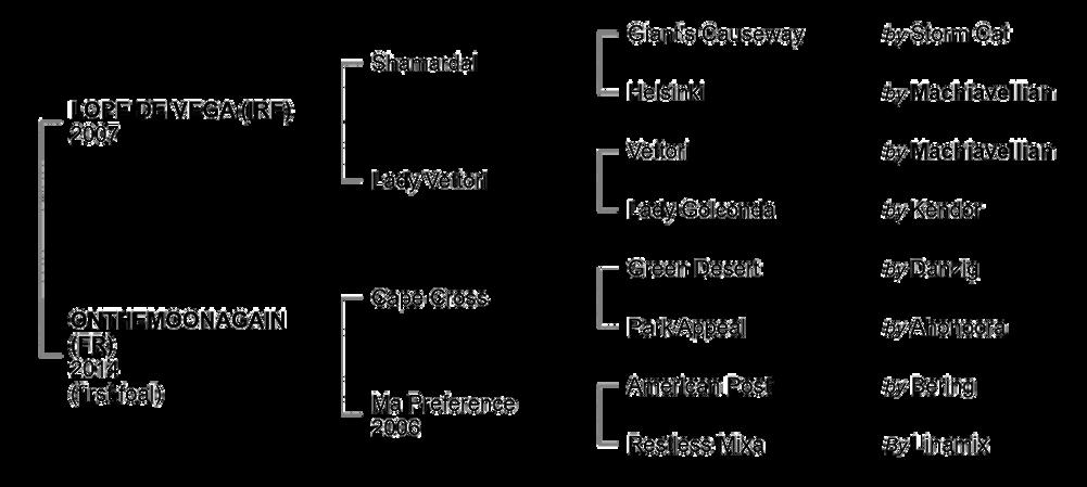 Lope de Vega X Onthemoonagain F CLICK HERE TO WATCH VIDEO PEDIGREE ANALYSIS LOT 102 Sire Line - Damsire line nicks Lope de Vega x Cape Cross 23 rnrs, 21 wnrs, 7 SHs, 5 SWs, 3 GWs, 1 G1Ws Lope de Vega x Green Desert 105 rnrs, 69 wnrs, 16 SHs, 9 SWs, 4 GWs Shamardal x Cape Cross 40 rnrs, 24 wnrs, 5 SHs, 3 SWs, 2 GWs, 2 G1Ws