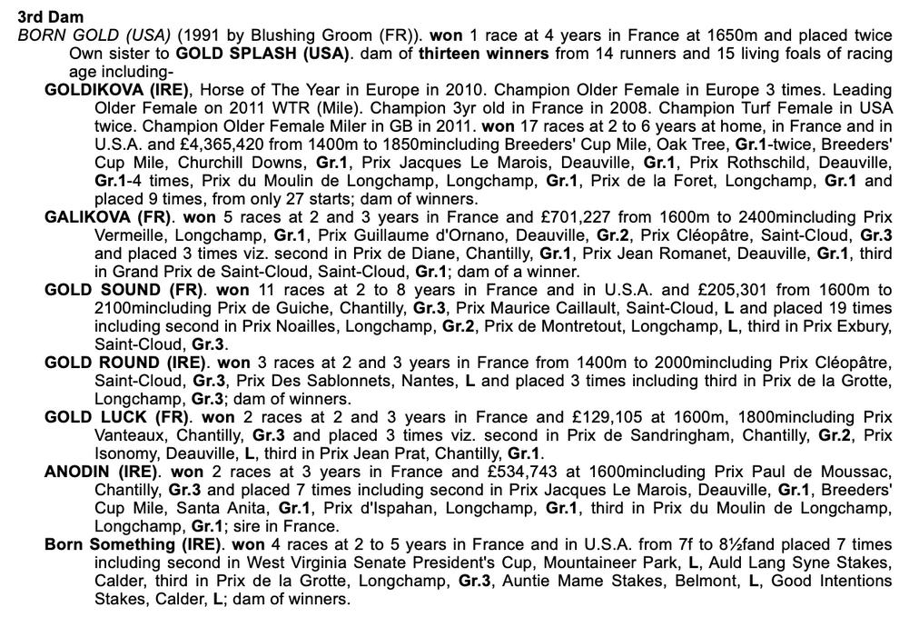 C CLICK HERE TO WATCH VIDEO PEDIGREE ANALYSIS LOT 1470 Sire Line - Damsire line nicks Galileo x Dalakhani 103 rnrs, 46 wnrs, 5 SHs, 3 SWs, 2 GWs NELSON, US ARMY RANGER, DYNAMIC, Kyrus Unicorn, Bright Approach Galileo x Darshaan 297 rnrs, 196 wnrs, 68 SHs, 45 SWs, 26 GWs, 4 G1Ws