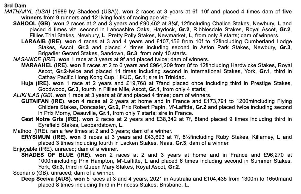 C CLICK HERE TO WATCH VIDEO PEDIGREE ANALYSIS LOT 1507 Sire Line - Damsire line nicks Galileo x Speightstown 19 rnrs, 13 wnrs, 3 SHs Galileo x Gone West 474 rnrs, 262 wnrs, 35 SHs, 18 SWs, 8 GWs, 3 G1Ws HENNIE SIX, ORDER OF ST GEORGE, SULTANINA, CAYENNE PEPPER, MEHDAAYIH, PIZ BADILE, LIGHT REFRAIN, GIUSEPPE PIAZZI, EL HABEEB, WEXFORD NATIVE