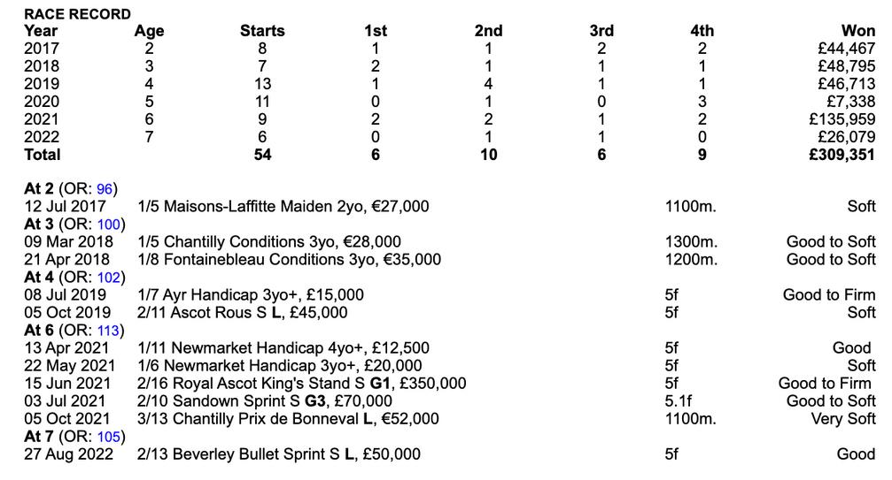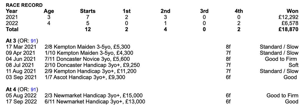 Preferred distance: 7f - 1m but would stay 9/10f Preferred ground: Any