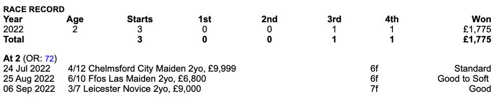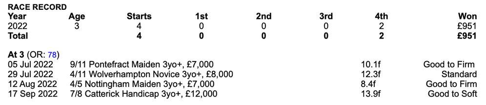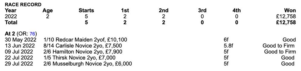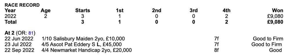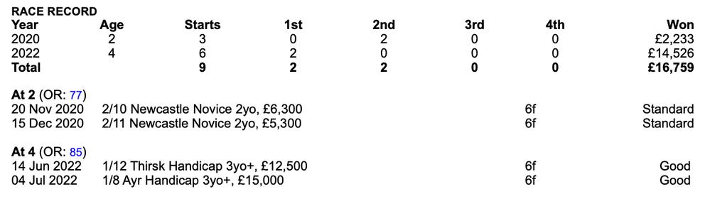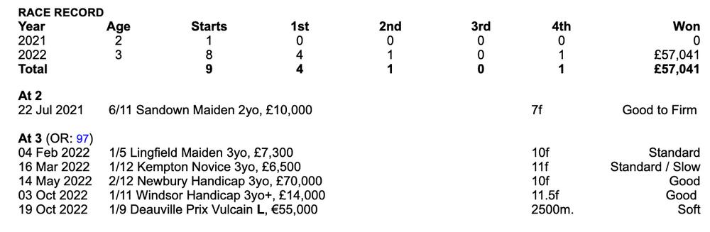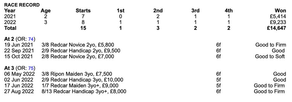 Preferred ground: Good/ good to firm Trainers notes: Winner of two races and placed on two further occasions from just five starts.