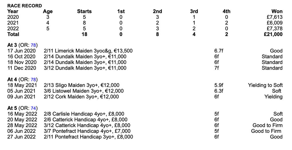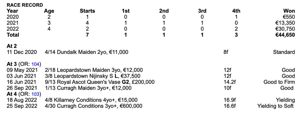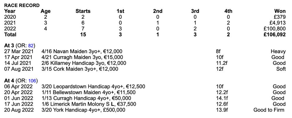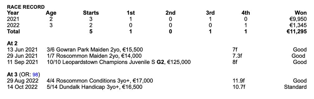 Trainer: Paddy Twomey Preferred distance: 1m4f - 1m6f Preferred ground: Good Trainers notes: