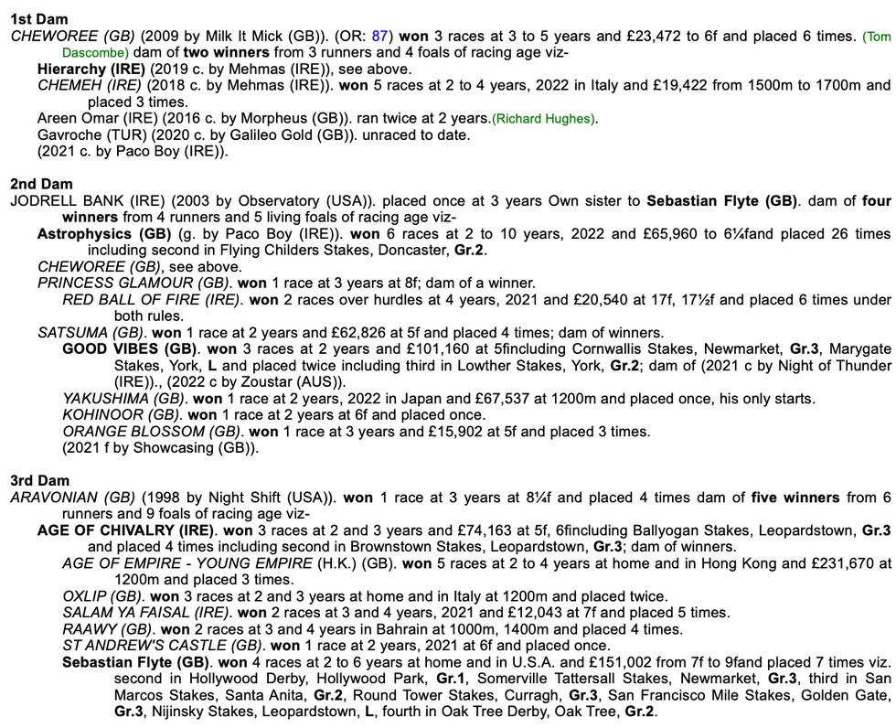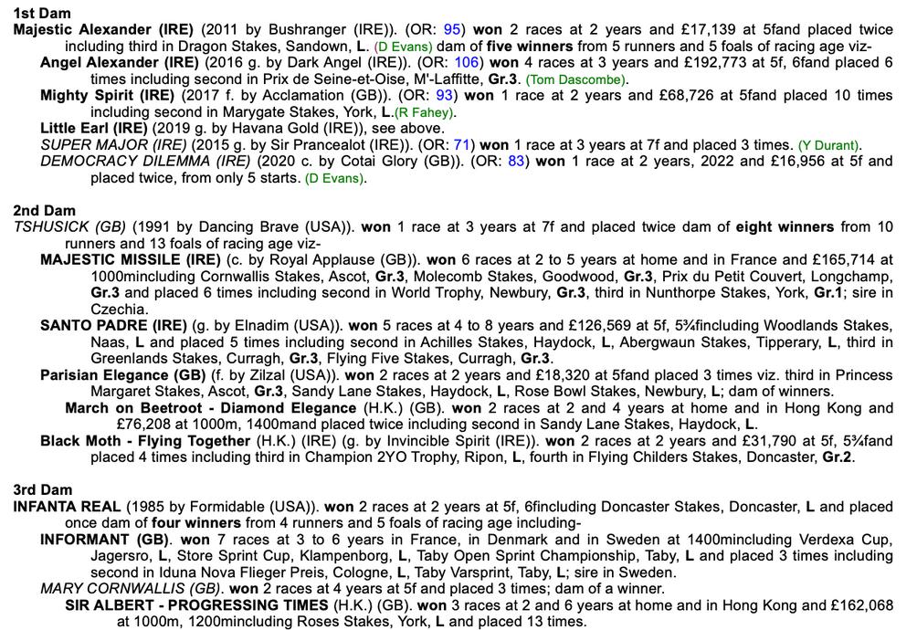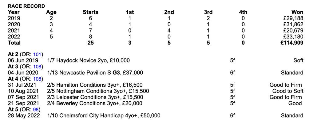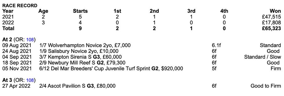 Preferred ground: Good/goodtofim Trainers notes: Wore tongue tie at Royal Ascot, Clearly good enough to win a maiden and should be able to hold his form in valuable handicaps when back on song given some of his form. Still to work out whether he’s better over 5f or 6f can probably continue to mix the two. Has run well from the front or off the pace.