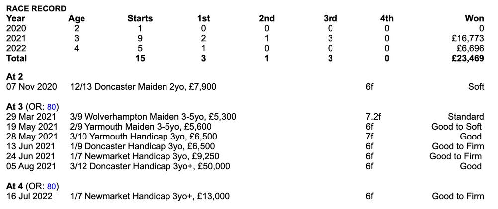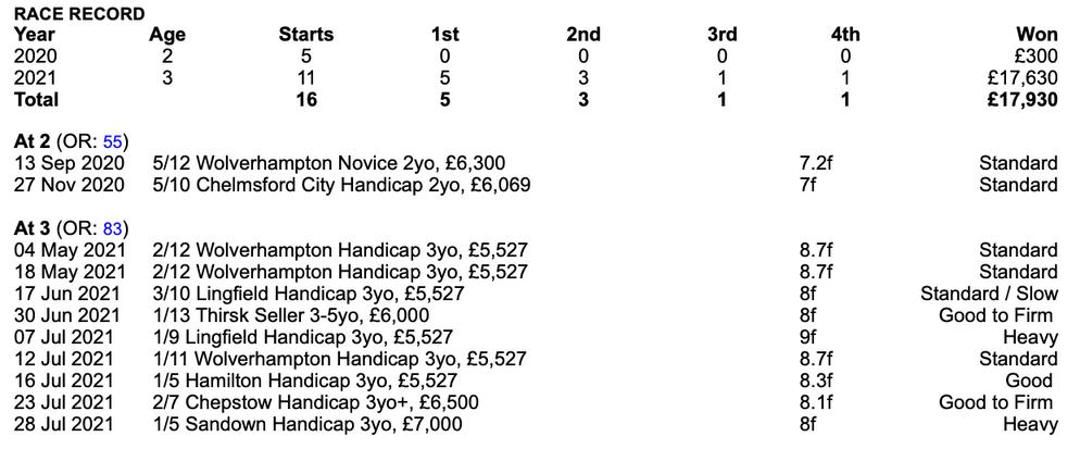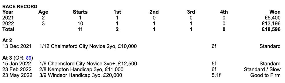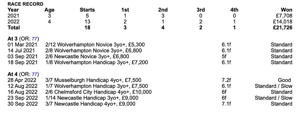 Preferred distance: 5f Preferred ground: Good or softer / AW Trainers notes: Has worn a visor trainer see's his future in handicaps as he is lightly raced .