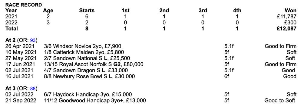 Preferred distance: 6f Preferred ground: Good Trainers notes: Doing very well physcially and will improve next year, has worn sheepskin cheekpieces twice.