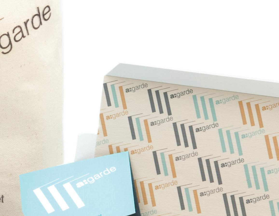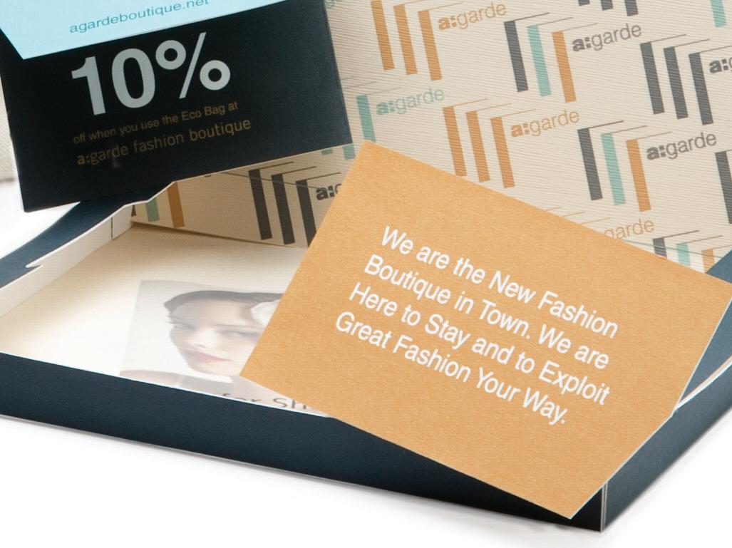 The promotional mailer contains an Eco Friendly canvas bag that communicates the boutique’s identity screen printed onto the bag along with a 10% discount card for the potential shopper to utilize each time they shop at a:garde.