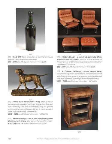 1214 1214 Modern Design - a pair of tubular metal office armchairs and footstools, by Dux, in the manner of Marcel Breuer and the Bauhaus, deep buttoned leather upholstery, 77cm wide £60 - £100 plus 21% Buyer’s Premium + VAT @20% 1215 A Chinese hardwood circular centre table, dreamstone top above a shaped and pierced frieze carved with fruiting vine, serpentine legs and stretchers carved with leafy bamboo, 75cm high, 76cm diameter, c1900 £600 - £800 plus 21% Buyer’s Premium + VAT @20%