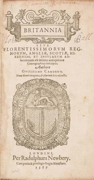 5 Camden (William). Britannia sive Florentissimorum regnorum, Angliae, Scotiae, Hiberniae, et insularum adjacentium ex intima antiquitate chorographica descriptio; Florentissimorum regnorum, Angliae, Scotiae, Hiberniae, et insularum adjacentium ex intima antiquitate chorographica descriptio; Hiberniae et insularum Britanniae adiacentium descriptio; Hiberniae et insularum Britanniae adjacentium descriptio, 2 parts in 1, 2nd edition, London: [Printed at Eliot’s Court Press] Radulphum Newbery, 1587, [16], 1-384, 401-648, [22] pp., woodcut device to general title and second part title, lacking leaves 2C1-2C8 and final blank, near-contemporary manuscript ownership signature ‘John Ball’ to general title, errata printed to the verso of the final index leaf, woodcut initials and head & tailpieces, later endpapers, contemporary calf, blind roll-work decoration to boards, modern reback and title label, lacking ties, 8vo