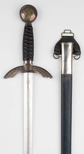 439* Third Reich. A National Socialist Flying Corps (N.S.F.K.) dagger by Josef Munch, Brotterode, the 17.5 cm plain double-edge blade with cutler’s mark, silver plated crossguard with black enamel swastika, blue morocco leather grip and plated pommel, overall length 30.5 cm, in its blue leather scabbard with plated mounts stamped with N.S.F.LK. logo, with brown leather sword strap, a nice example of a scarce dagger (1)