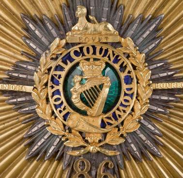 511* Royal County Down. A rare Irish bell-top shako, circa 1829-1844 of the 86th (Royal County Down) Regiment of Foot, the cylindrical body covered with black velvet with red and white ball tuft, with leather peak and sunk top, the front with a gilded shako plate of crowned star, centre applied with Maid of Erin harp laid on green enamel with band inscribed ‘Royal County Down’ on dark blue enamel and a laurel wreath and battle honours for Egypt with Sphinx, India and Bourbon, this laid on a silver star, with ‘86’ beneath, the V shape side straps with gilt bosses each with crown surmounted by a lion facing left, gilt chin scales, the lining with black velvet band and the top with red silk, in generally good condition
