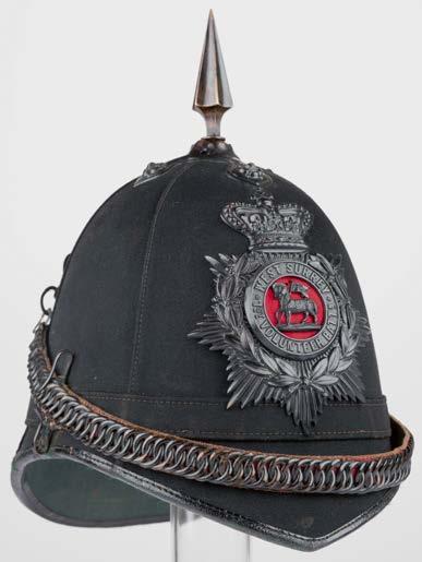 507* The Royal West Surrey Regiment. A Victorian officers’ home service blue cloth helmet (1881-1901), with gilt brass helmet plate featuring the paschal lamb in silver to the centre laid on red cloth, with the motto ‘Honi Soit Qui Mal Y Pense’ (shame on him who thinks evil of it), a silver three part scroll beneath inscribed ‘The Royal West Surrey Regiment’, gilt cross and spike finial, chin scales witth black velvet backing and gilt rosettes, tan leather sweatband and pink lining, a nice example with minimal wear and presented on a wooden stand (1)