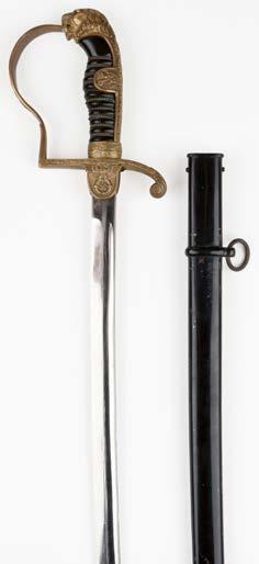 436* Third Reich. A German Army Officers’ sword, the 77.5 cm slightly curved steel blade by Anton Wingen Jr, with gilt metal guard, two langets, one cast with eagle emblem, the other vacant shield cartouche, wirebound black wood or celluloid grip, stirrup knuckleguard, oak leaf and acorn backstrap, lions head pommel set with ‘ruby’ red stone eyes, overall length 90 cm, in its black painted metal scabbard, a nice clean and presentable example (1)