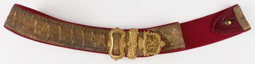 466* Inniskilling Dragoons. An Edwardian Irish officer’s waist belt of the 6th Inniskilling Dragoons, the seeded gilt buckle mounted with a silver Castle of Enniskilling within acorn and oak leaf wreath, VI below and a two part banner inscribed ‘Inniskilling Dragoons’, the belt with gold braiding on red leather (1)