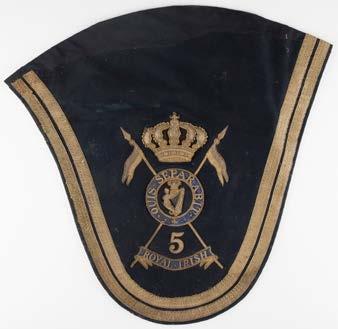 490* Royal Irish Lancers. A Victorian section from a horse shabraque of the 5th Royal Irish Lancers, crowned Maid of Erin harp within a circular border ‘Quis Separabit’, with crossed lances and 5 Royal Irish beneath, all in gold and blue bullion thread on a dark blue cloth ground with two lines of gold braiding to the edge, 56 x 57 cm (1)