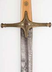 434* Sword. An Indian tulwar, 19th century, the 59 cm curved steel blade engraved along the top edge, a fine “Bidri” grip, overall length 74 cm, in its black leather scabbard, with engraved steel tip (1)